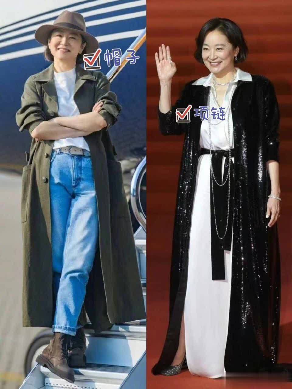 这种版型的外套能够凸显出她挺拔的身姿,同时掩盖身材上的一些小缺陷,使她的身形看起来更加完美。线条感的版型完美契合了她英气的五官长相,能够展现出林青霞独特的大女人气场。