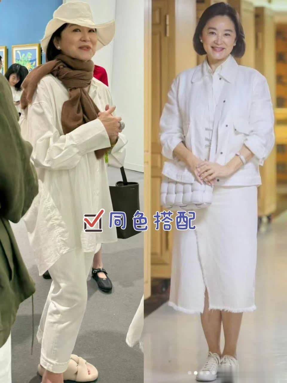 女性一定不要被年龄所掌控,只要懂得穿衣打扮,自然可以让你看上去更加迷人。林青霞的这一组同色系的搭配方案,就很值得大家去尝试,一身白色看上去清爽又减龄,虽然都是白色,但是因为面料的不同,所以也很好的营造出了层次感。